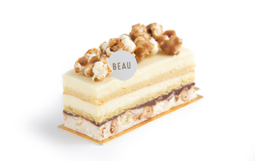 Cashew nougat, milk chocolate ganache, semolina sponge, butter popcorn mousse, white chocolate glaze, caramel popcorn