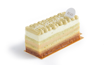 White sesame praline crumble, coconut and palm sugar paste, mung bean crème brulée, pandan sponge, palm sugar crémeux, coconut & pandan mousse, green tea Swiss meringue buttercream,