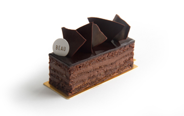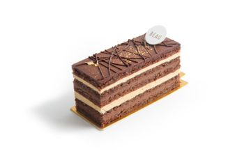 Chocolate joconde, coffee syrup, dark chocolate crémeux, salted caramel buttercream, dark chocolate glaze, gold leaf